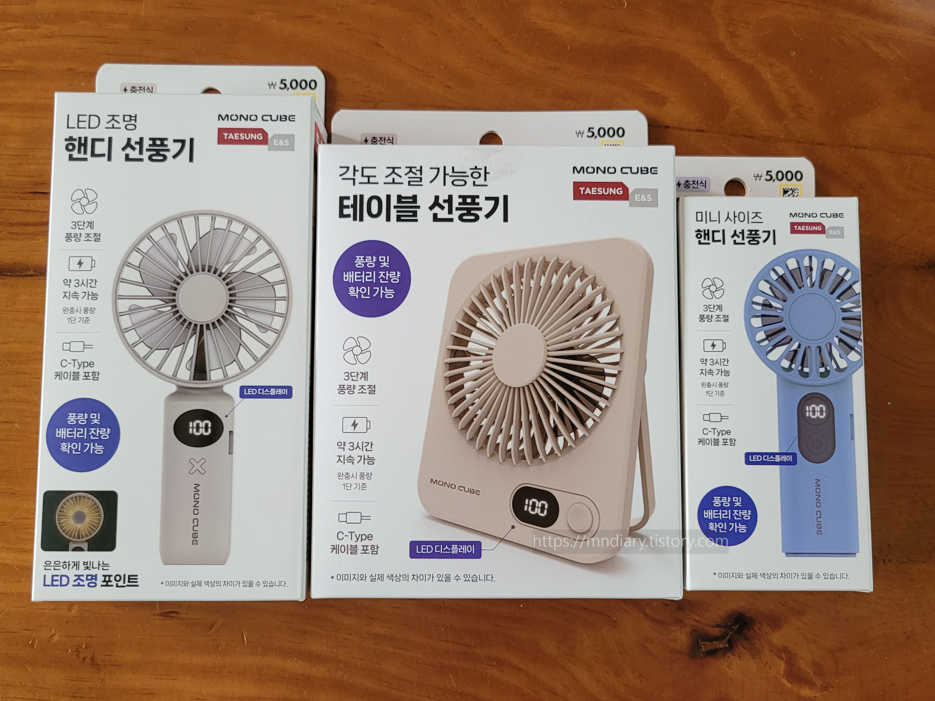 최근에 다이소에서 산 것 중에 제일 마음에 드는 것!바로바로 핸디 선풍기와 테이블 선풍기!! 재작년 여름에 동생이 내 핸디 선풍기를 빌려갔다가 잃어버린 이후로다시 사기 귀찮아서 안사고 작년 여름을 버텼는데올해는 더 더워질거라고 하기도 하고 피크민 블룸을 여름에도 즐기기 위해서 핸디 선풍기를 사야겠다고 생각했다.그런데 마침 다이소에 가니까 오천 원에 살 수 있길래 냉큼 집어왔다! 한 3주 전쯤에 샀고 너무나도 잘 쓰는 중!각 오천원으로 3개를 사서 총 15,000원 내고 구매했다 왜 3개나 샀냐면!제일 왼쪽 빅 핸디 선풍기는 엄마 쓰라고 샀고테이블 선풍기는 공부하면서 사용하려고 샀고마지막으로 미니 핸디 선풍기는 내가 들고 다니면서 쓰려고 샀다. 빅 핸디 선풍기 구성품은 이렇게!본체와 c타입 충전선, 그리고..